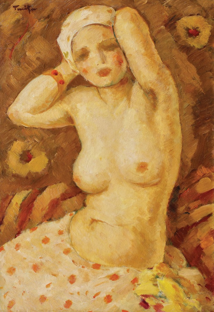 Modelul Afiz infatiseaza inca o data feminitatea orientala, scaldata in lumina solara a Balcicului, fiind surprins intr-un moment in care isi intoarce privirea catre contemplatorul sau, care ii asterne pe panza trasaturile languroase intr-o spledoare de ocru cu urme de oranj. Ornamentarea vesmantului si a salului ce o acopera sumar sunt reprezentate subtil, armonizand perfect cu tonurilecalde utilizate la nuantarea trupului, a carui coloristica se aseamana luminii lumanarilor de ceara cu reflexe ce se prefac in semitonuri de nuanta mierii. Tonitza era atras de culorile nudului, destainuind calitatile acestuia si elevilor sai, fiind de parere ca un nud strange intr-insul toata lumea din jur si apoi o imprastie ca un mic soare , dand nastere unor cromatici fara seaman, spuneau reprezentantii Artmark referitor la pictura.