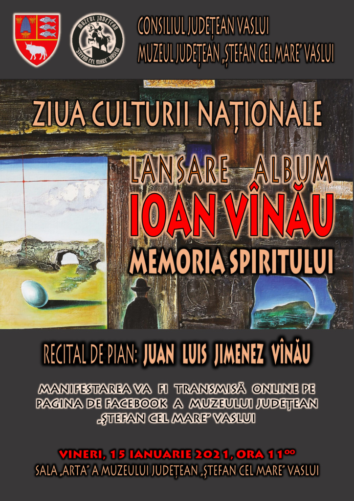 Muzeul Județean „Ștefan cel Mare” Vaslui și alături de Consiliul Județean invită publicul la Manifestarea cultural-artistică „ZIUA CULTURII NAȚIONALE”, vineri, 15 ianuarie 2021, ora 11.00, în Sala „Arta” a Muzeului Județean. Evenimentul va fi transmis online pe pagina de Facebook a instituției. Activitatea cuprinde lansarea albumului de artă „IOAN VÎNĂU – MEMORIA SPIRITULUI” și un recital de pian, susținut de JUAN LUIS JIMENEZ VÎNĂU.
