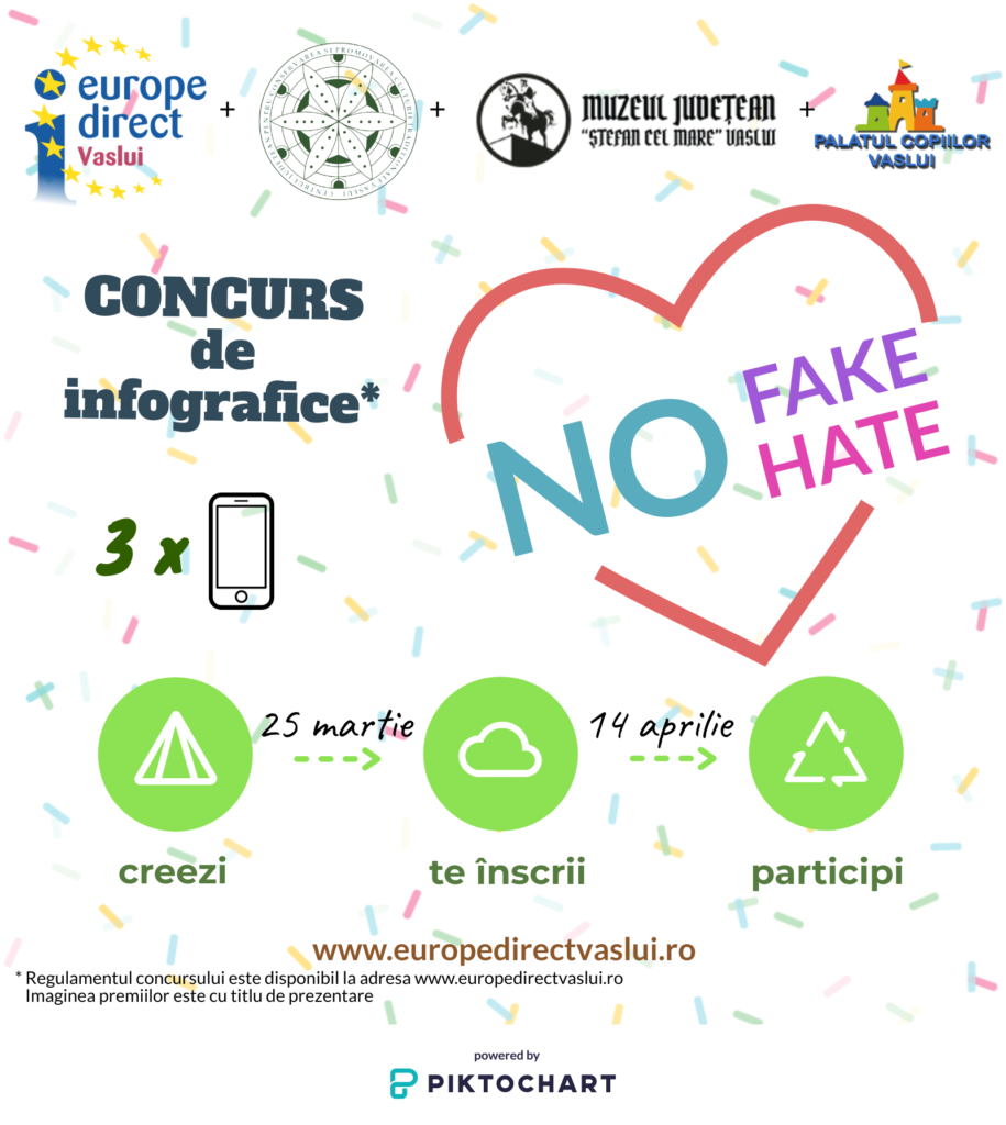 Europe Direct Vaslui și Consiliul Județean Vaslui, în parteneriat cu Centrul Judeţean pentru Conservarea şi Promovarea Culturii Tradiţionale Vaslui, Muzeul Judeţean „Ştefan cel Mare” Vaslui și Palatul Copiilor Vaslui, invită toți cetățenii domiciliați în județul Vaslui să participe la concursul “No Fake, No Hate”.