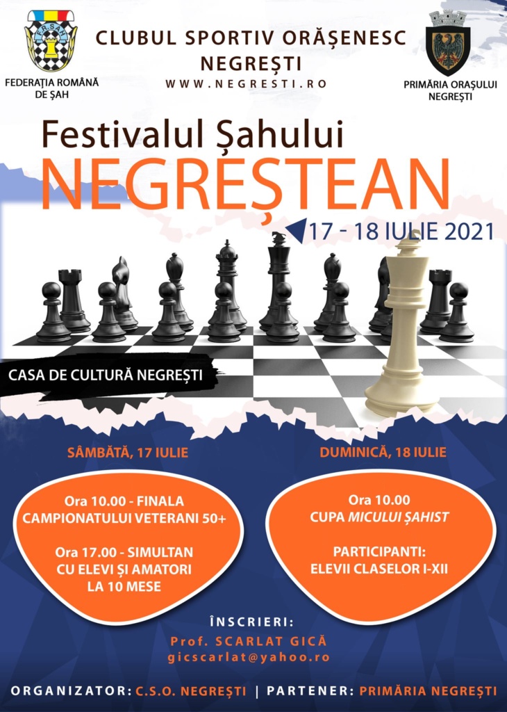 Clubul Sportiv Orășenesc Negrești, în colaborare cu Primăria orașului Negrești, organizează pentru zilele de sâmbătă, 17 iulie 2021, și duminică, 18 iulie 2021, „Festivalul șahului negreștean”, eveniment la care va putea participa orice negreștean, fie el elev sau pensionar, care iubește acest sport.