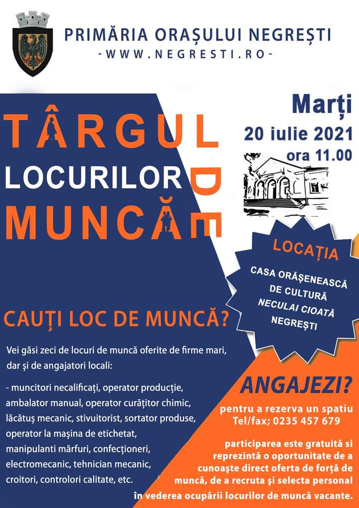 „Primăria orașului Negrești organizează marți, 20 iulie 2021, începând cu ora 11.00, la Casa Orășenească de Cultură «Neculai Cioată» din Negresti, Târgul locurilor de muncă. Dacă vă căutați un loc de muncă sau vreți să faceți o schimbare în carieră, vă invităm să discutați direct cu angajatorii ce vor fi prezenți la eveniment. Unii din cei mai mari angajatori din zonă și-au anunțat deja prezența și vor avea standuri de prezentare cu ofertele locurilor de muncă active. Pe această cale, informăm agenții economici interesați despre faptul că participarea la acest eveniment este gratuită și reprezintă o oportunitate de a cunoaște direct oferta de forță de muncă, de a recruta și selecta personal în vederea ocupării locurilor de muncă vacante”, este invitația edililor negreșteni la eveniment.