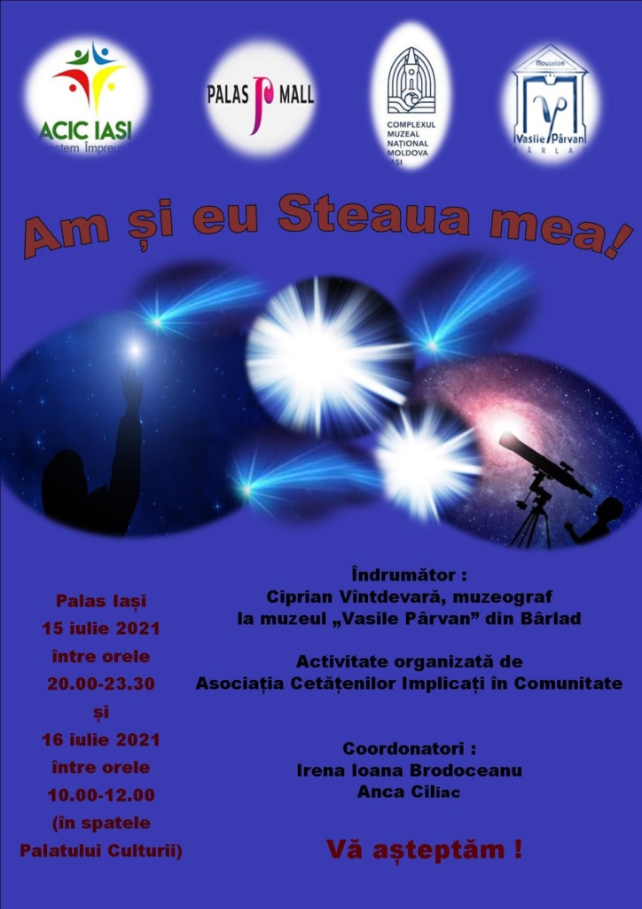 Sub motto-ul „Am și eu Steaua mea”, Observatorul Astronomic din cadrul Muzeului „Vasile Pârvan” Bârlad organizează între 15-16 iulie, o sesiune de observaţii astronomice în zona centrală a municipiului Iaşi, în apropiere de Palatul Culturii. Activitatea se va desfăşura pe parcursul a două zile. Joi, 15 iulie, între orele 20.00 – 23.30, va avea loc o prezentare publică, urmată de observaţii astronomice prin intermediul unui telescop din dotarea muzeului bârlădean.