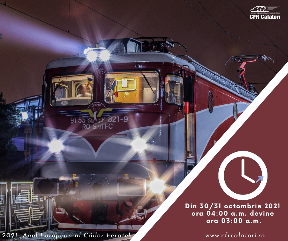 Începând din 31 octombrie 2021, în activitatea de transport feroviar de pasageri s-a trecut la ora Europei Orientale, ora 4 AM devenind ora 3 AM. Trecerea la ora de iarnă nu a modificat mersul trenurilor în vigoare.