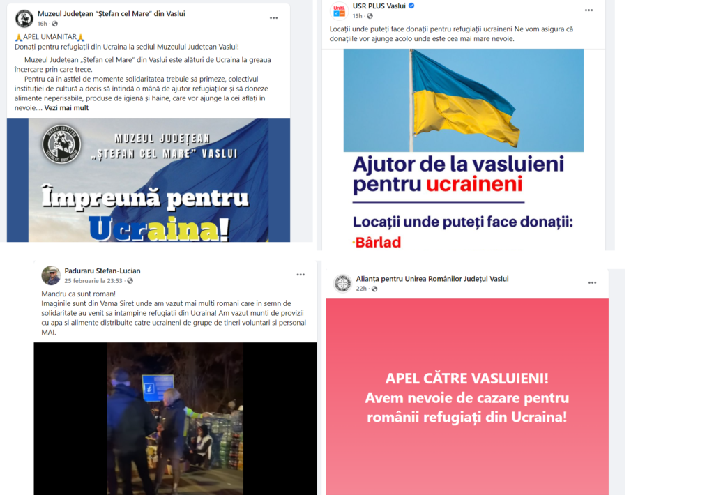 Deși județul nostru nu se află la granița cu Ucraina, vasluienii s-au mobilizat pentru a veni în sprijinul ucrainenilor care și-au părăsit casele de teama bombardamentelor. De la un proprietar de magazin alimentar, Lucian Păduraru, care a pornit spre graniță cu apă și alimente, până la instituții publice, precum Prefectura Vaslui, care și-a propus să organizeze și integreze sprijinul popular, la instituții de cultură, precum Muzeul Județean, care a făcut un apel umanitar inițiind o acțiune de donare în propriul spațiu, dar și partidele politice ca USR, donații, și AUR, care a organizat cazarea refugiaților, vasluienii și-au manifestat solidaritatea cu victimele acțiunilor militare din Ucraina.