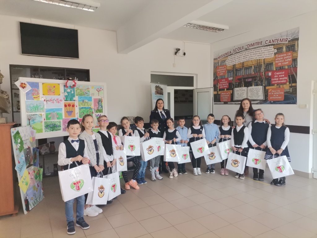 Reprezentantul Compartimentului de Analiză și Prevenire a Criminalității și doamna învățătoare au explicat regulile de siguranță și împreună cu elevii au făcut exerciții din broșura Școala Siguranței Tedi.