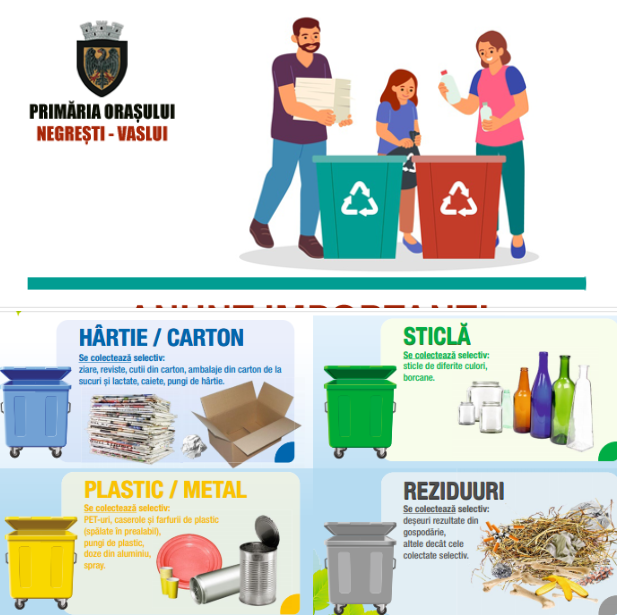 „Primăria Negrești va continua acțiunile de sprijinire și încurajare a colectării selective. Așteptăm ca și dumneavoastră să dați dovadă de responsabilitate și să sprijiniți demersurile noastre prin depozitarea gunoiului doar la punctele de colectare amenajate și dotate cu containere pentru colectarea selectivă”, li se transmite locuitorilor orașului Negrești.