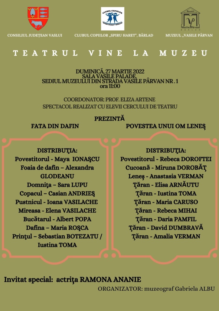 Ziua Mondială a Teatrului va fi sărbătorită la Muzeul ,Vasile Pârvan”, Bârlad, care vă invită, duminică, 27 martie 2022, ora 11:00, la o activitate inedită în colaborare cu Cercul de Teatru al Clubului Copiilor „Spiru Haret”, Bârlad.
