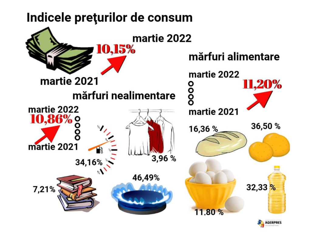 Rata anuală a inflaţiei a urcat la 10,15% în luna martie 2022, de la 8,53% în februarie, în condiţiile în care mărfurile nealimentare s-au scumpit cu 10,86%, cele alimentare cu 11,20%, iar serviciile cu 6,53%. (AGERPRES)