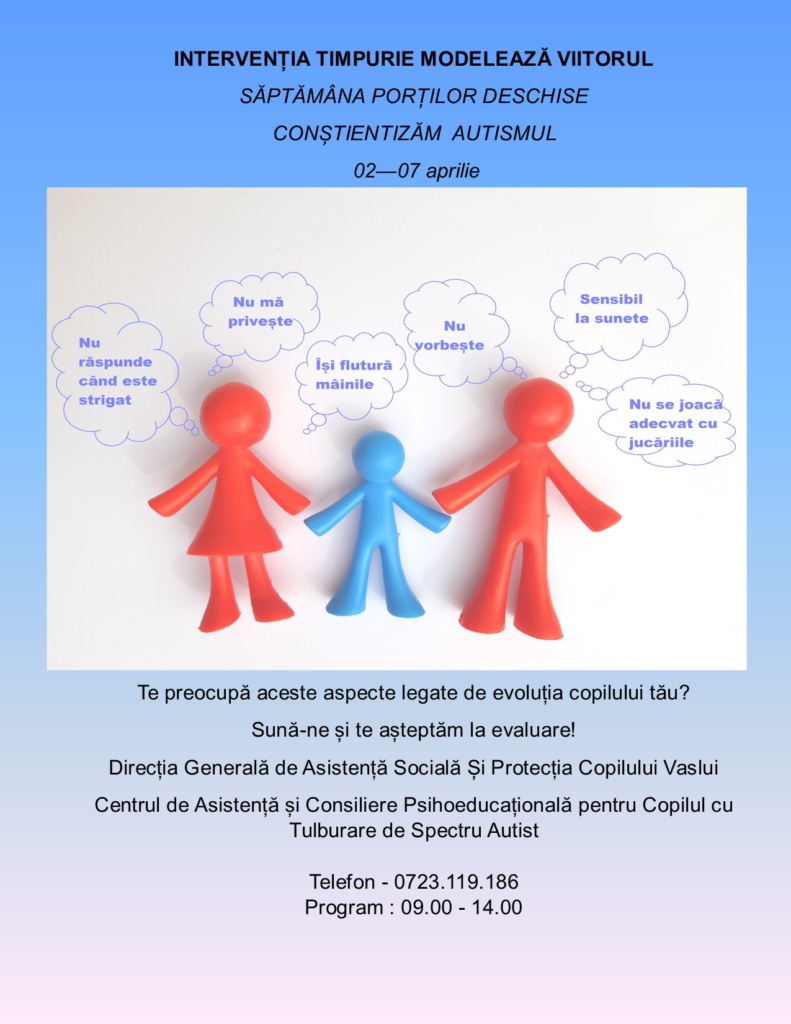 Scopul acestor activități este de a crește gradul de conștientizare a fiecărui părinte care are un copil cu vârsta cuprinsă între 6 luni și 3 ani în privința anumitor suspiciuni legate de comportamentul acestuia. Copilul dumneavoastră nu răspunde la nume? Nu înțelege ceea ce i se spune? Nu vă privește atunci când îi vorbiți? Dacă intuiția de părinte vă spune că acesta este diferit de ceilalți copii de vârsta lui, vă așteptăm în cadrul Complexului (cunoscut în comunitatea vasluiană sub denumirea Centrul Paiu) pentru evaluare psihologică gratuită în timpul săptămânii 2-7 aprilie, inclusiv sâmbătă și duminică, între orele 09.00 – 14.00.