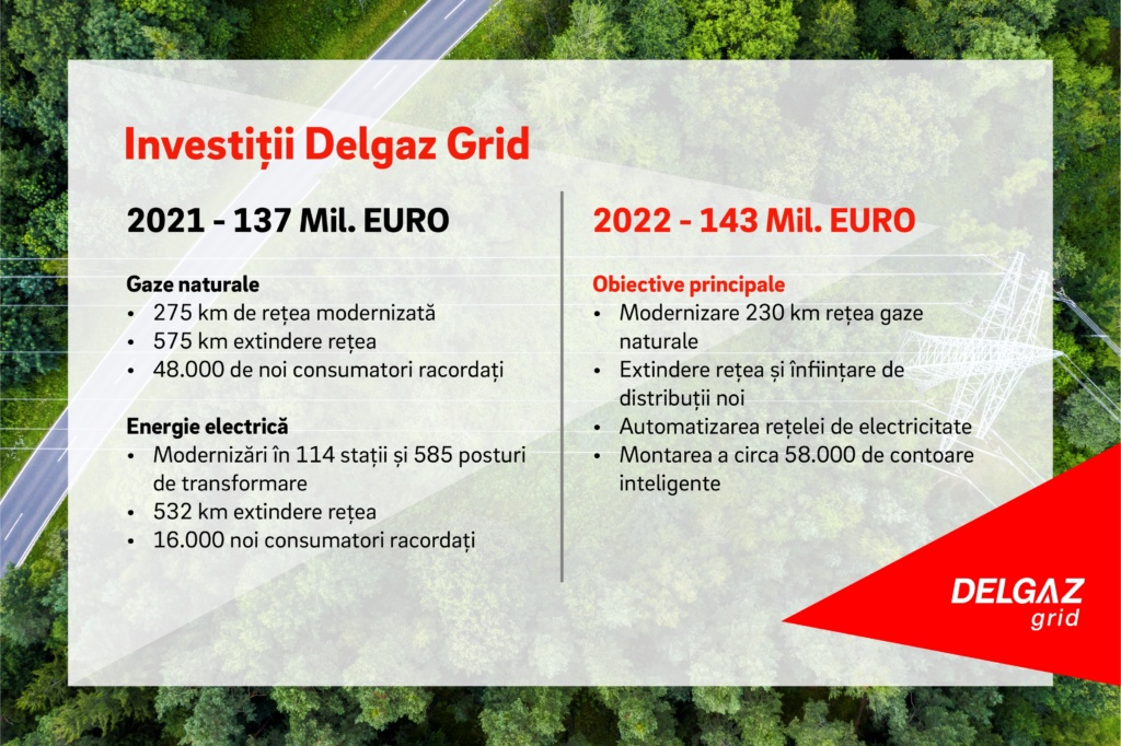 Pe partea de gaze naturale sunt bugetate investiții de 73 mil. euro, o sumă similară fiind prevăzută pentru aria de electricitate. Rețeaua de gaze va fi modernizată pe o lungime de 230 km. Vor fi instalate circa 58.000 de contoare inteligente, care se adaugă celor peste 12.600 de unități montate în 2021.