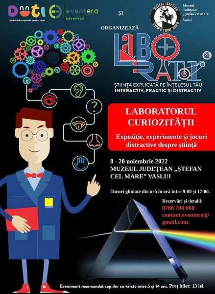 Muzeul Judeţean „Ştefan cel Mare” Vaslui organizează în perioada 8 -20 noiembrie, în parteneriat cu Eventera, expoziţia interactivă „Laboratorul de curiozităţi” pentru copii între 5 și 14 ani.