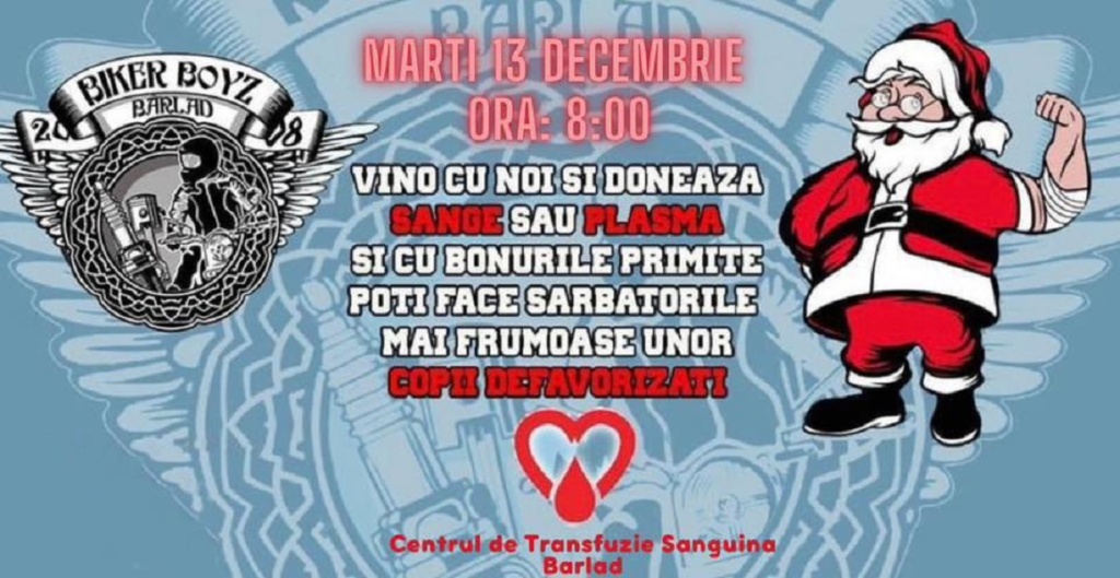 „Dragi bârlădeni, Centrul de Transfuzie din Bârlad se confruntă cu o criză acută de sânge. Comunitatea moto din Bârlad se mobilizează și, pe data de 13 decembrie, la ora 08.00, donează sânge și plasmă! «Bikerboyz» Bârlad vă invită să ne fiți alături și să ne mobilizăm în număr cât mai mare și în orașul nostru! Bonurile obținute în urma donării vor fi transformate în cadouri pentru copiii fără posibilități! #BarladOrasulFaptelorBune”, este invitația lansată, pe 12 decembrie, de motocicliști către toți cei care vor să li se alăture.