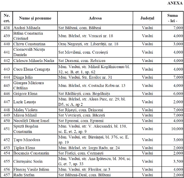 La nivelul județului Vaslui, vorbim despre 20 de beneficiari, care urmează să primească ajutoare în valoare de 89.500 lei. Cinci dintre ei se află în situații de necesitate cauzate de incendii care au afectat atât locuințele, anexele gospodărești, cât și bunurile de folosință îndelungată, familiile respective confruntându-se cu probleme socio-materiale și de locuit, unele dintre acestea având și probleme de sănătate, motiv pentru care se află în imposibilitate ca din veniturile proprii să-și poată repara locuințele. Aceștia vor primi în total 34.000 lei.