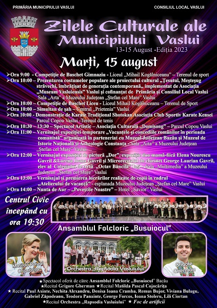 De la ora 19.30 în Centrul Civic va concerta Ansamblul Folcloric „Busuiocul”, după care vasluienii vor putea asista la mai multe recitaluri ale unor artiști locali și naționali, precum Matilda Pascal Cojocărița, Remus Bujor, Paul Axinte, Nechita Amexandu, Lili Ciortan, Ioana Stoleru, Teodora Panainte etc.