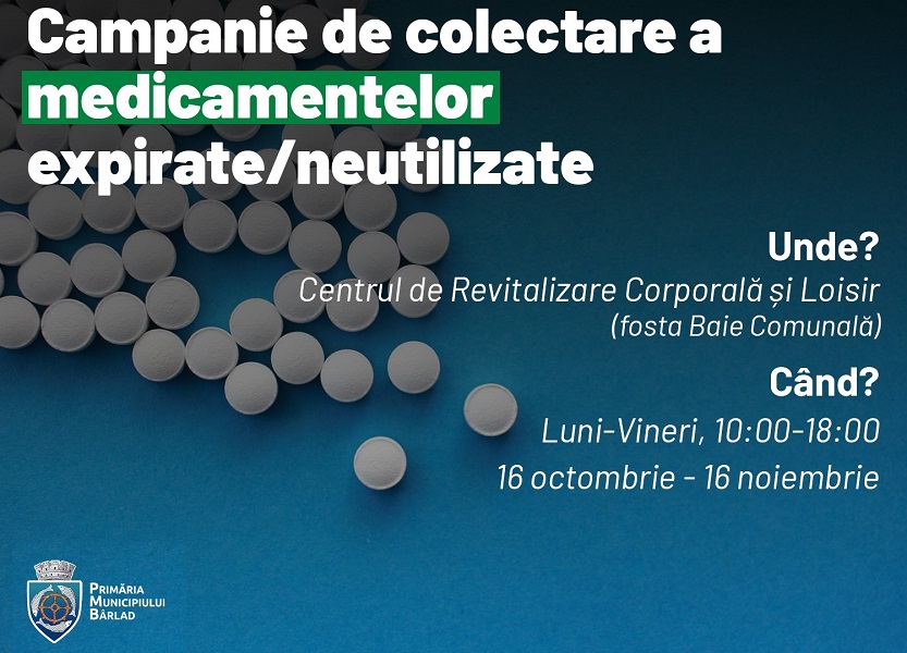 „A început o nouă campanie de colectare a medicamentelor expirate la Centrul de Revitalizare Corporală și Loisir (fosta Baie Comunală). Programul este de luni până vineri, în intervalul 10.00-18.00. Bârlădenii pot aduce medicamente uzate și neutilizate în punctul de colectare până pe 16 noiembrie. Le mulțumesc bârlădenilor care aleg să protejeze mediul și, bineînțeles, transmit această informație mai departe. Este ultima astfel de campanie organizată la Centrul de Revitalizare Corporală. De la 1 ianuarie 2024, va intra în vigoare legea USR care va permite returnarea medicamentelor expirate sau neutilizate în locuri special amenajate în curțile spitalelor în regim permanent. E important să ținem cont de faptul că medicamentele nu pot fi aruncate în coșul de gunoi obișnuit, acestea producând poluarea pânzei freatice, ori dacă sunt folosite necorespunzător, pot cauza intoxicații. Astfel, medicamentele aruncate de bârlădeni vor fi colectate în recipiente speciale, urmând ca o firmă autorizată să le distrugă în mod corespunzător. ATENȚIE! Nu sunt colectate medicamentele din categoria preparatelor psihotrope sau precursori de droguri, conform Legii nr. 339/2005 (medicamente eliberate pe formulare verzi sau galbene) și citostatice!”, a anunțat viceprimarul Ana-Maria Vintilă.