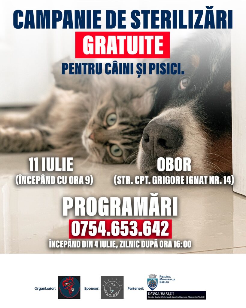 Proprietarii de câini și pisici din Bârlad sunt invitați să se înscrie la cea de-a treia acțiune de sterilizare gratuită a patrupedelor din anul 2024. Invitația este valabilă doar pentru animalele de companie care nu au fost supuse intervenției chirurgicale în precedentele acțiuni similare.