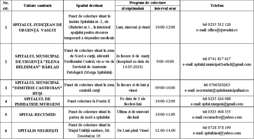 În vederea gestionării deşeurilor de medicamente neutilizate şi/sau expirate provenite de la populaţie, Direcția de Sănătate Publică Județeană Vaslui a reamintit populației județului Vaslui că la nivelul unităților sanitare cu paturi au fost organizate puncte de colectare a deșeurilor de medicamente neutilizate și/sau expirate.