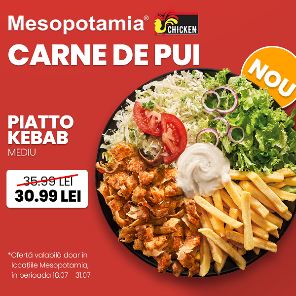 Din 29 iunie, Mesopotamia introduce în meniul său carnea de pui rotisată, o alternativă perfectă pentru iubitorii de pui. Carnea de pui folosită este de cea mai înaltă calitate, fragedă și suculentă. Acest nou produs vine cu un amestec special de condimente care îi conferă o notă ușor picantă, dar extrem de aromată.