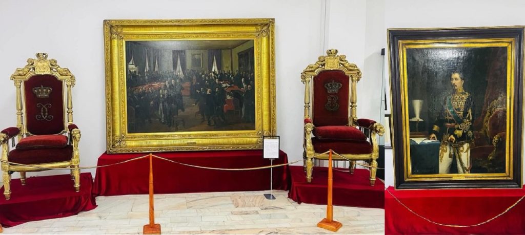 „La sosirea lui Carol I în România, acesta s-a stabilit în reședința de la Cotroceni, ocupată anterior de Alexandru Ioan Cuza. Ca urmare, el a folosit, pentru o vreme, nu doar personalul palatului, ci și mobilierul (probabil și o parte a veselei din argint a predecesorului său). Carol I a păstrat inclusiv tronurile, cu stema Principatelor Unite, folosite de Alexandru Ioan și Elena Cuza. Tronurile au primit monogramele regale, ale lui Carol I și a Elisabetei, care se află și astăzi pe spătare. Acestea au fost folosite inclusiv la ceremonia Încoronării, din anul 1881”, se spune într-o prezentare a expoziției.