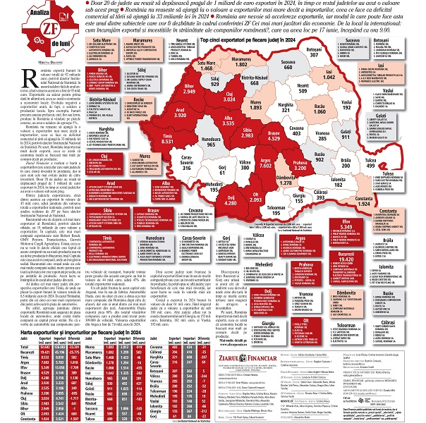 În contextul în care cinci județe din țară – București, Timiș, Argeș, Ilfov și Brașov – cumulează aproape jumătate din totalul exporturilor naționale (45 miliarde euro), discrepanțele între regiunile țării sunt tot mai mari. Bucureștiul, lider absolut la exporturi, a înregistrat anul trecut o valoare de 19,4 miliarde euro, la mare distanță față de orice alt județ, însă, așa cum am arătat, importurile sunt, de asemenea, uriașe în această zonă, în care veniturile și consumul sunt cele mai mari din țară.