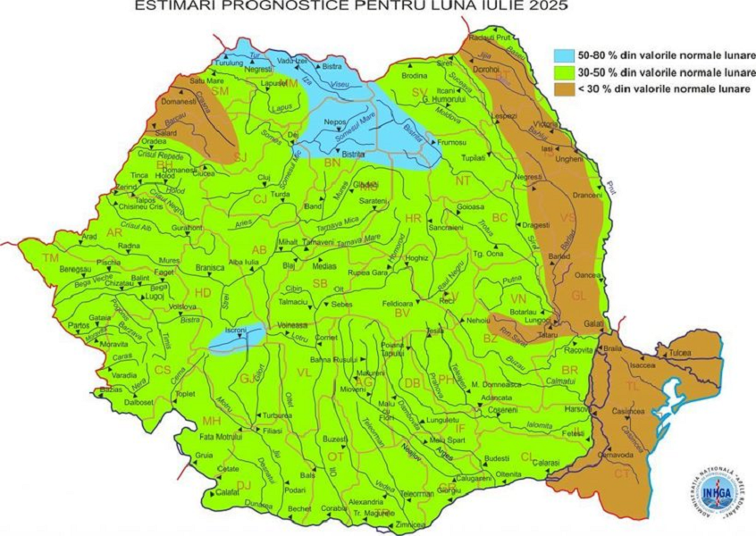 „În luna iulie 2025, specialiştii Institutului Naţional de Hidrologie şi Gospodărire a Apelor estimează că debitele râurilor din România se vor situa, în general, sub valorile normale pentru această perioadă a anului. Potrivit prognozei hidrologice lunare, regimul hidrologic va înregistra valori cuprinse între 30% şi 50% din mediile multianuale lunare, ceea ce indică un nivel mai scăzut al rezervelor de apă în majoritatea bazinelor hidrografice”, a transmis, joi, Institutul Național de Hidrologie și Gospodărire a Apelor, într-o postare pe Facebook.