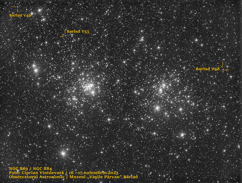„Toate stelele au fost detectate mai întâi în cadrele noastre, folosind imagini obținute cu telescopul de astrofotografie și cercetare științifică de la Observatorul Astronomic al Muzeului «Vasile Pârvan» din Bârlad. Precizez că nu am descoperit stele noi, ci am constatat că stelele analizate sunt variabile. Acestea au primit denumiri suplimentare (pe lângă cele deja existente în cataloage) – «Bârlad V48», «Bârlad V49» și «Bârlad V53», dintre care V48 și V53 fac parte din roi, câte una în fiecare dintre cele două roiuri, așa cum am marcat în imaginea de la postare. De acum înainte, să vă gândiți că, atunci când observați Roiul Dublu din Perseu, în fiecare roi există câte o stea variabilă numită după orașul Bârlad, precum și o altă stea, tot cu numele orașului, care nu are legătură fizică cu roiul, dar care se află pe direcția noastră de observație spre roi. Informații suplimentare găsiți în noul articol publicat pe site-ul AstroBârlad: https://astrobarlad.com/…/stele-variabile-cu-numele…/”, și-a încheiat muzeograful Vîntdevară informarea.