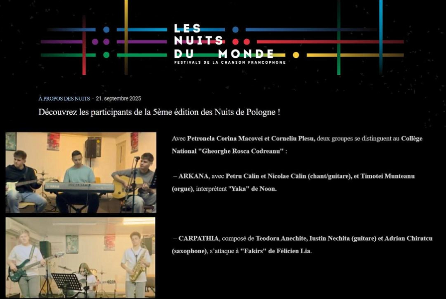 Motiv de mândrie pentru elevii și profesorii Colegiului Național „Gheorghe Roșca Codreanu” Bârlad! Două grupuri vocal-instrumentale formate din elevi ai liceului care cântă în limba franceză vor participa la Festivalul Internațional al Cântecului Francofon „Les Nuits de Pologne” – ediția 2025, care va avea loc la Poznań (Polonia) în perioada 13–17 noiembrie.
