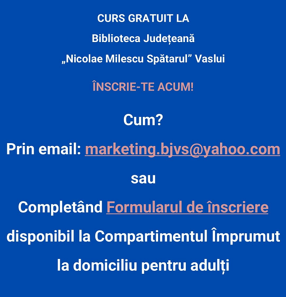 Persoanele interesate se pot înscrie la Compartimentul Împrumut la domiciliu pentru adulți din cadrul Bibliotecii Județene „Nicolae Milescu Spătarul” Vaslui sau prin email la adresa: marketing.bjvs@yahoo.com.